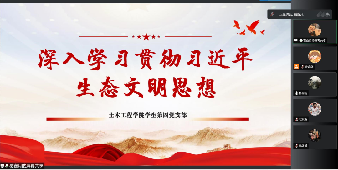 会议第一项,党员葛鑫月同志带领大家深入学习习近平生态文明思想。习近平生态文明思想是习近平总书记立足我国生态文明建设实践形成的原创性理论成果,主要包括坚持和加强党对生态文明建设的全面领导、不断满足人民日益增长的优美生态环境需要、深化对人与自然生命共同体的规律性认识、坚持生态环境保护标本兼治,常抓不懈等内容。它聚焦了新时代命题,凝结了新思想精华,具有气度恢宏、系统完备、精辟透彻的理论特色,为推进美丽中国建设、实现人与自然和谐共生的现代化提供了方向指引和根本遵循。
