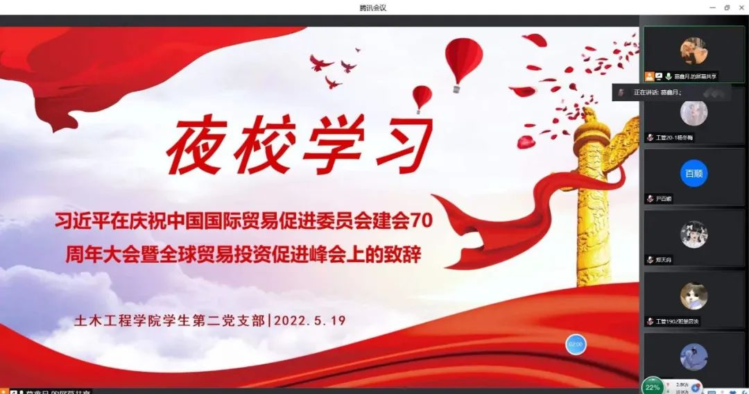 2022年5月19日21:00,英国365集团公司员工第二党支部通过腾讯会议开展了以“习近平在庆祝中国国际贸易促进委员会建会70周年大会及全球贸易投资促进峰会上的致辞”为主题的线上学习。本次学习的主持人为党员葛鑫月同志,参加本次学习的有二支部全体党员。