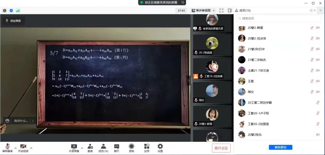 网课期间,同学还未能解决当堂课中所遇到的课堂疑惑,下堂课的腾讯会议号就已接踵而至,久而久之,种种问题的“堆积”,催使同学们产生焦虑心理。针对这类现象,二支部优秀学长学姐通过“云”自习对同学们的学习进行辅导。线性代数这一学科对于大多数同学十分深奥,为此学长学姐在“云”自习当中,为大家播放了“猴博士”线性代数相关教学视频。视频内容通俗易懂,语言幽默诙谐,帮助同学答疑解惑。“云”自习期间,同学认真听讲,积极做笔记,巩固课堂知识的同时,思索解题的新思路、新方法。