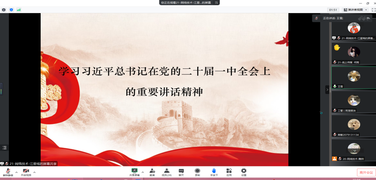 文创党小组开展本次学习,本次学习主持人为秦丽娜同志。首先由党员时晓旭同志、刘昱莹同志、张淼琪同志对此次学习内容进行讲解,并由积极分子分享自己的理解与感悟,最后由秦丽娜同志对本次学习进行总结:我们要深刻认识全会选举产生的新一届中央领导机构是一个政治坚定,团结统一,富有活力,能够适应党和国家事业长远发展需要的中央领导集体,为团结带领全党全国各族人民全面建设社会主义现代化国家和中华民族伟大复兴提供了坚强的政治保证和组织保证。