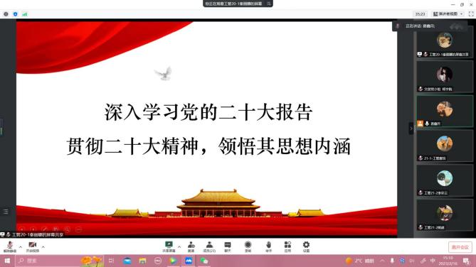 宣传党小组开展本次学习,本次学习主持人陈敏同志。首先由党员陈敏、孙英敏、鞠帅同志分别从“高质量发展”、“教育、科技、人才是全面建设”、“尊重自然、顺应自然、保护自然”三个方面对此次学习内容进行讲解。接着由积极分子进行发言:作为新时代的接班人我们要肩负起历史使命,抱有远大理想、努力提高自身素养,要有能吃苦耐劳的精神、有责任感、并且树立终身学习的观念,通过不断的学习来适应社会,高举中国特色社会主义伟大旗帜,奋力谱写全面建设社会主义现代化国家崭新的篇章。