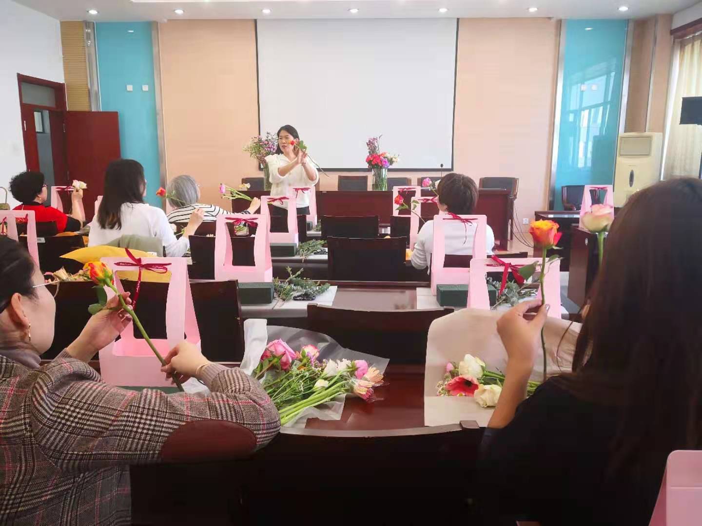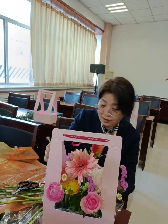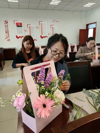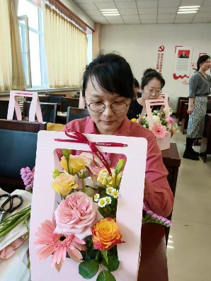 活动现场,花艺老师为大家介绍了花艺知识、讲授了插花技巧及鲜花保养方法。女教工们个个心灵手巧,修枝剪叶,搭配色系,普通的花叶、枝条,经过大家精心的修饰与加工之后,变成了令人赏心悦目的插花作品。在花香四溢的生机与浪漫中,大家舒缓身心,充分感受到生活的美好与情趣。