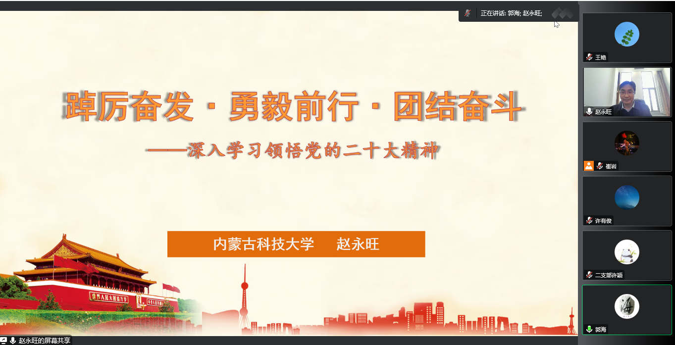 赵永旺部长立足高等教育事业和学校“十四五”发展规划,提出三点要求,一是党员干部要带头学,切实在学懂、弄懂、做实上下功夫;二是教职工要深入学,切实将报告精神融入立德树人全过程;三是青年员工要自觉学,切实让青春在全面建设社会主义现代化国家的火热实践中绽放绚丽之花。