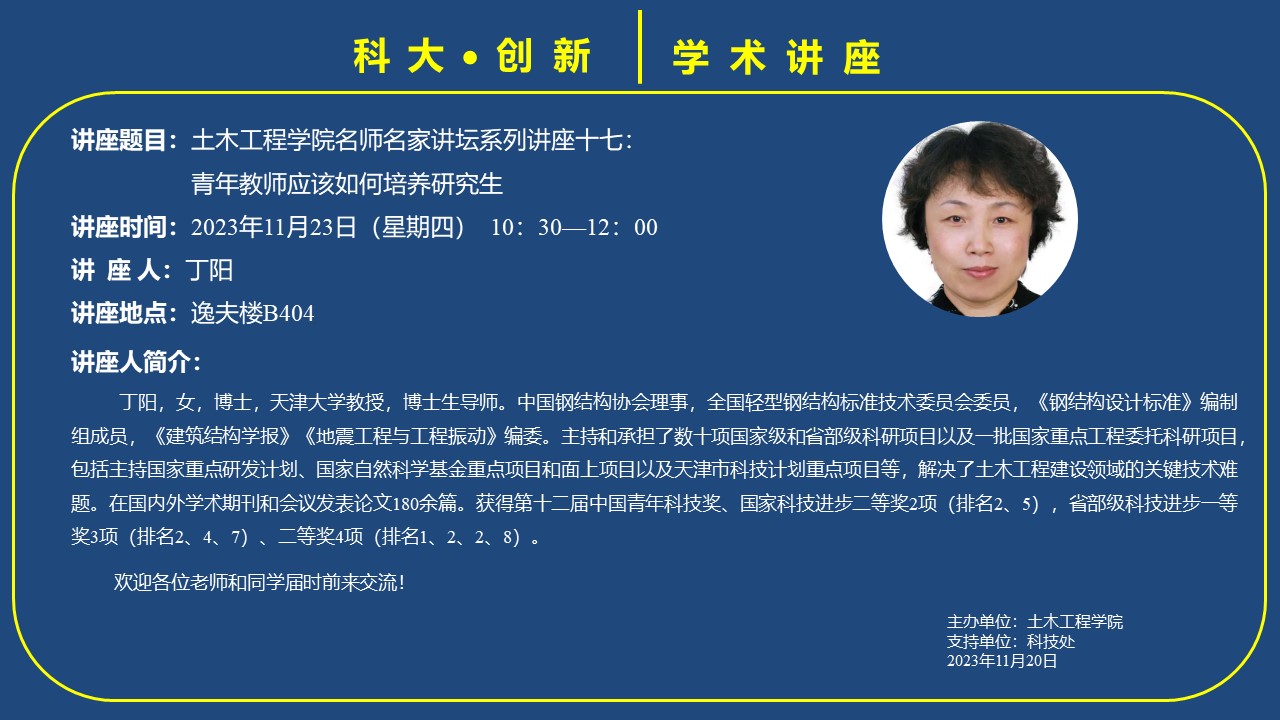 丁阳,女,博士,天津大学教授,博士生导师。中国钢结构协会理事,全国轻型钢结构标准技术委员会委员,《钢结构设计标准》编制组成员,《建筑结构学报》《地震工程与工程振动》编委。主持和承担了数十项国家级和省部级科研项目以及一批国家重点工程委托科研项目,包括主持国家重点研发计划、国家自然科学基金重点项目和面上项目以及天津市科技计划重点项目等,解决了土木工程建设领域的关键技术难题。在国内外学术期刊和会议发表论文180余篇。获得第十二届中国青年科技奖、国家科技进步二等奖2项(排名2、5),省部级科技进步一等奖3项(排名2、4、7)、二等奖4项(排名1、2、2、8)。