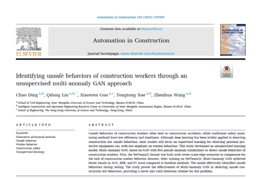近日,建筑工程信息化领域的国际顶级期刊《Automation in Construction》(建造自动化)正式刊登公司丁超副教授学术成果“Identifying unsafe behaviors of construction workers through an unsupervised multi-anomaly GAN approach”(基于无监督多异常GAN方法识别建筑工人的不安全行为)。丁超副教授为论文第一作者,硕士生刘祺龙为论文第二作者及通讯作者,郭晓文讲师为第三作者,硕士生薛童童为第四作者,王振华讲师为第五作者。论文第一单位为英国365集团公司和内蒙古自治区高校智能建造与运维工程研究中心。