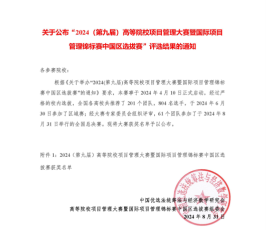 高等院校项目管理大赛是由华罗庚教授创立的中国优选法统筹法与经济数学研究会主办,由其下设的项目管理研究委员会(PMRC)负责组织实施,面向高等院校在校员工的全国性项目管理学科创新性竞赛,同时也是“国际项目管理锦标赛(PMC)”的中国区选拔赛,目的在于进一步推动项目管理理论和实践成果在中国高等院校青年老员工中的普及和应用,促进中国项目管理的专业化、信息化、国际化和项目经理的职业化。PMC是由国际项目管理协会(IPMA)主办,面向全球高校员工的国际性项目管理创新性竞赛,高等院校项目管理大赛至2024年已举办至第九届,在大赛中获奖即可对标获得国际IPMP职业资格证书,具有极高的含金量和认可度。