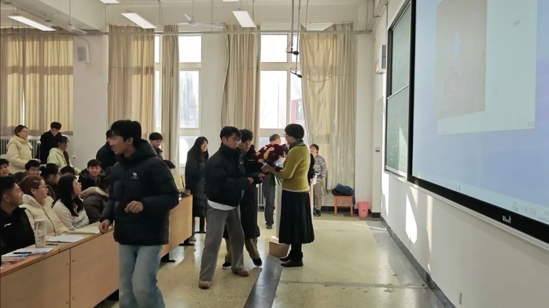 在鲜花致敬环节,员工与教师代表依次献花,表达对徐老师的感谢与祝福。徐伟老师手捧鲜花在感言中回顾了在校十六年的岁月,感谢学院与师生的支持,并表示将继续关注教育、助力青年教师成长。真挚的话语引来阵阵掌声,不少师生感动落泪。