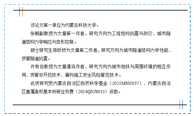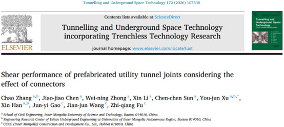近日,公司隧道智慧建养与深地储能技术团队张朝副教授在Tunnelling and Underground Space Technology期刊(JCR一区,中科院一区TOP,IF=7.4)发表题为“Shear performance of prefabricated utility tunnel joints considering the effect of connectors”(DOI: https://doi.org/10.1016/j.tust.2026.107538)的研究成果。