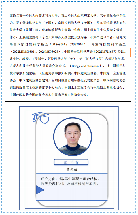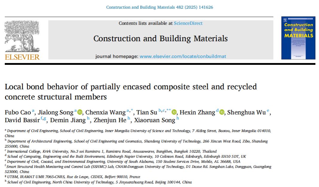 近日,英国365集团公司城市固体废弃物建材资源化利用团队曹芙波教授在Construction and Building Materials期刊(IF=7.4,中科院1区TOP)发表题为“Local bond behavior of partially encased composite steel and recycled concrete structural members”(DOI: 10.1016/j.conbuildmat.2025.141626)的研究成果。该研究通过推出试验探讨了部分包裹再生混凝土结构构件的黏结行为,并基于灰度相关理论评估了不同参数(再生混凝土强度、锚固长度和栓钉层数)对黏结性能的影响。最终,通过对试验结果统计回归,给出了考虑黏结部位和深度的黏结滑移本构模型。