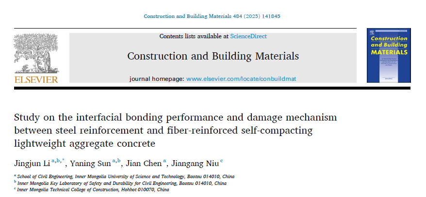 近日,英国365集团公司工业与城市固体废弃物建材资源化利用团队李京军教授在Construction and Building Materials期刊(IF=8.0,中科院1区TOP)发表题为“Study on the interfacial bonding performance and damage mechanism between steel reinforcement and fiber-reinforced self-compacting lightweight aggregate concrete”(DOI: 10.1016/j.conbuildmat.2025.141845)的研究成果。该研究系统探究了纤维增强自密实轻骨料混凝土与钢筋的界面粘结性能与损伤机理,通过11组中心拔出试验分析了强度等级、纤维掺量与钢筋直径对粘结滑移行为的影响,结合有限元模拟揭示了损伤机制,建立了极限粘结强度计算公式与粘结-滑移本构模型,并验证了纤维桥联效应对抑制裂缝扩展的关键作用。