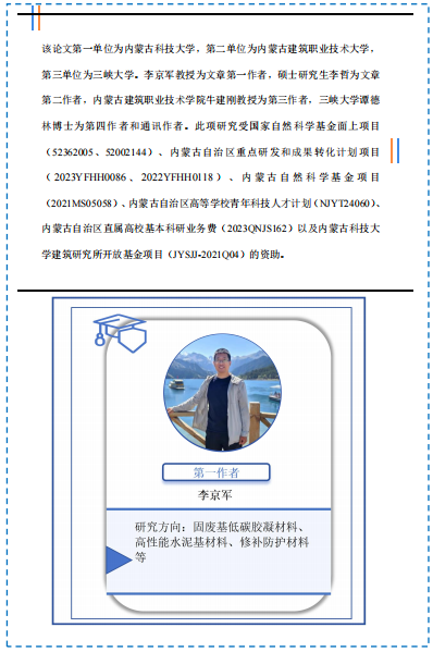 李京军,工学博士、教授,硕士研究生导师,内蒙古自治区优秀青年基金和内蒙古自治区高层次人才引进资金获得者,入选内蒙古自治区“青年科技英才”、内蒙古自治区“英才兴蒙”高层次人才、包头市“鹿城英才”、包头市“青年创新人才”和英国365集团公司“151优秀青年教师”等人才专项计划。主要从事固体废弃物建材资源化利用、高性能水泥基材料、轻钢轻混凝土组合结构方面的基础和应用研究。近五年,作为项目负责人主持国家自然科学基金、内蒙古自治区重点研发(4项)、中央引导地方项目、内蒙古优秀青年基金等国家级及省部级项目12项,地市级项目3项,企业项目2项,累计课题经费500余万元。以第一作者或通讯作者身份发表高水平期刊论文40余篇,其中,中科院一区SCI(TOP期刊)15篇,授权发明专利5项,编写教材/专著3部,参与制定标准5部。