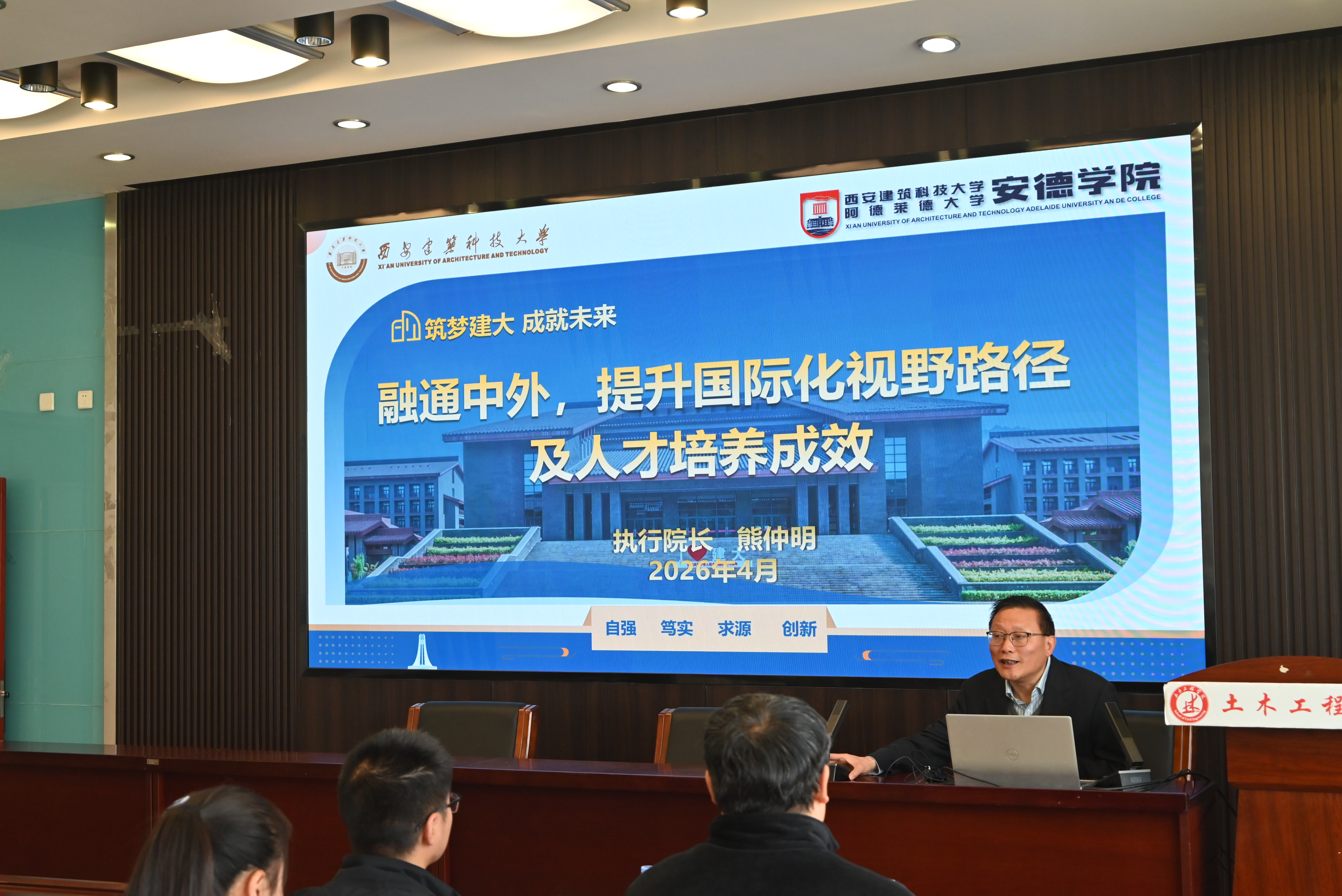 座谈开始前,熊仲明经理在逸夫楼B404作了题为《中外合作办学机构本科国际化人才培养体系的构建与实践—以安德学院为例》的学术讲座。作为结构工程领域的知名专家、教育部和陕西省中外合作办学评审专家,熊仲明经理结合自身丰富的办学管理经验与科研实践,向学院师生详细介绍了西安建筑科技大学安得学院的人才培养体系、国际合作交流模式、课程设置特色及实践教学成果,使学院师生了解了国际化办学前沿理念。