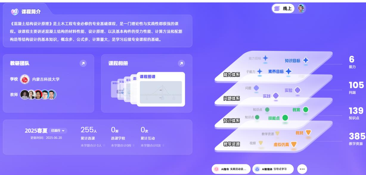 《混凝土结构设计原理》是土木工程专业的核心必修课,课程团队依托国家级一流课程和自治区级一流课程基础,于2024年11月成功立项“知识图谱课程”建设项目。历经半年多的系统建设,课程在数字化、智能化教学转型方面取得阶段性成果,初步构建起“知识图谱引领、虚实结合教学、思政融合育人”的智慧课程新形态。