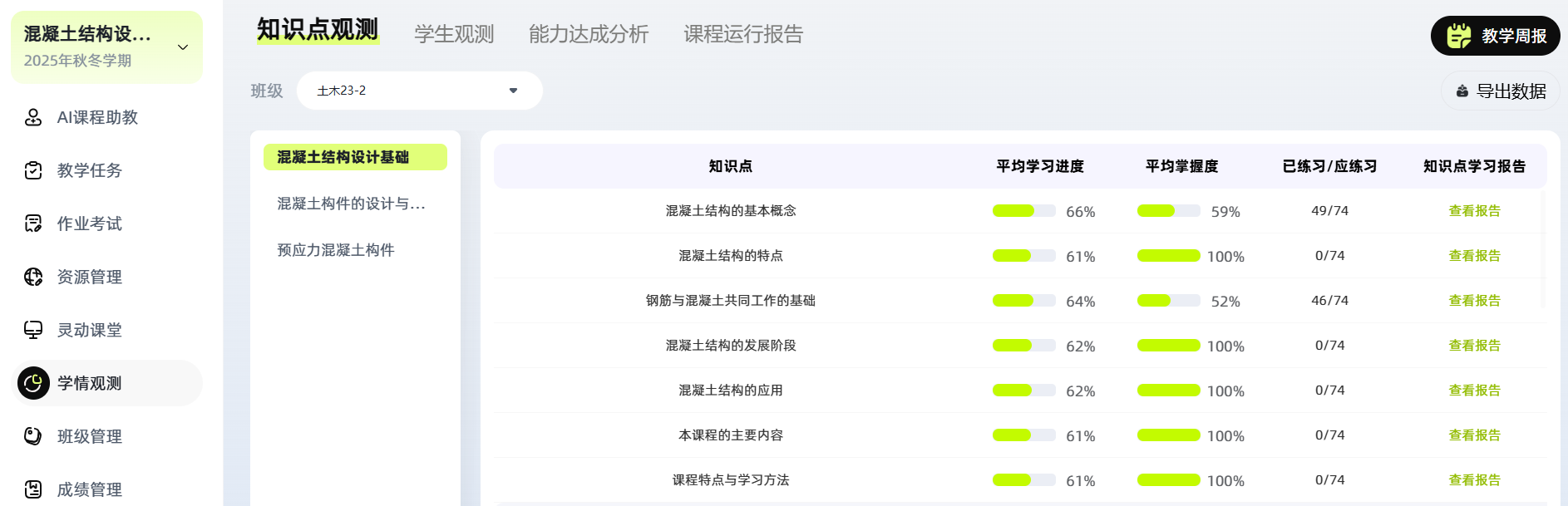 智慧树平台集成AI助学模块,可智能答疑并提供个性化学习建议,同时成为持续性学情观测的重要窗口。该模块不仅能够即时解析知识点,还会自动汇聚高频提问、错误知识点分布及员工互动轨迹等数据。教师可据此清晰把握班级整体与个体员工的认知难点,识别共性薄弱环节(如“受扭构件设计参数选取”),进而动态调整教学重点,实现“答疑-观测-优化”的闭环。AI模块与知识图谱、虚拟实验等环节的数据联动,共同构建出多维度、过程化的学情画像,使教学支持从“经验判断”转向“数据智能”,真正推动个性化学习与精准教学的实施。